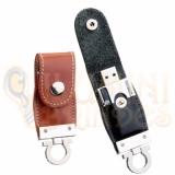 Pendrive de 16GB, material de couro sintético com detalhes em metal.